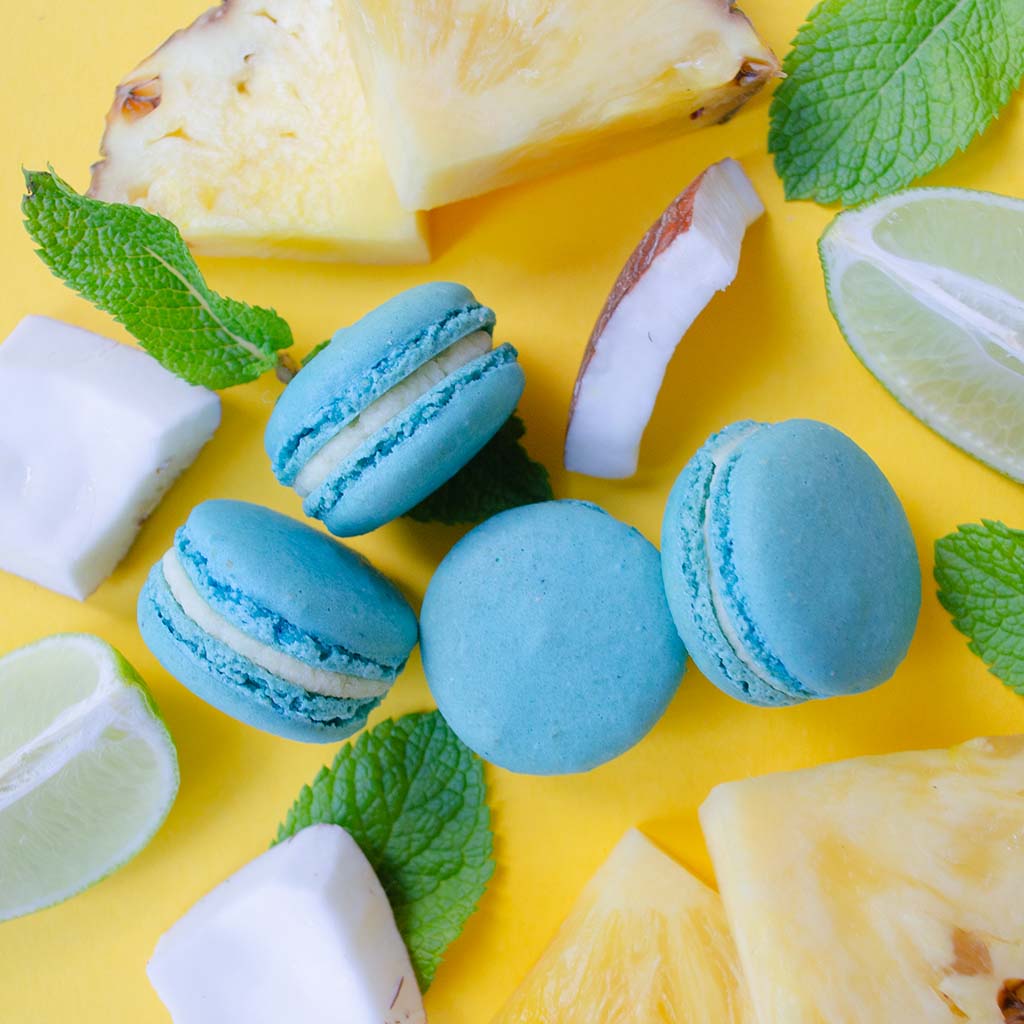 Stell Dir vor, Du spazierst an weißen Sandstränden entlang, der Sommerwind weht sanft durch Dein Haar und Du genießt einen kühlen Pina Colada. Genau dieses Gefühl vermittelt unser Karibik Traum Macaron. Eine cremige Kokosnuss-Ganache, verfeinert mit einem Hauch Limettensaft, trifft auf einen süßen Ananaskern. Diese einzigartige Kombination der Früchte der Karibik bringt Dir den perfekten Sommertraum nach Hause. Lass Dich verführen und erlebe einen Urlaubsmoment bei jedem Bissen!