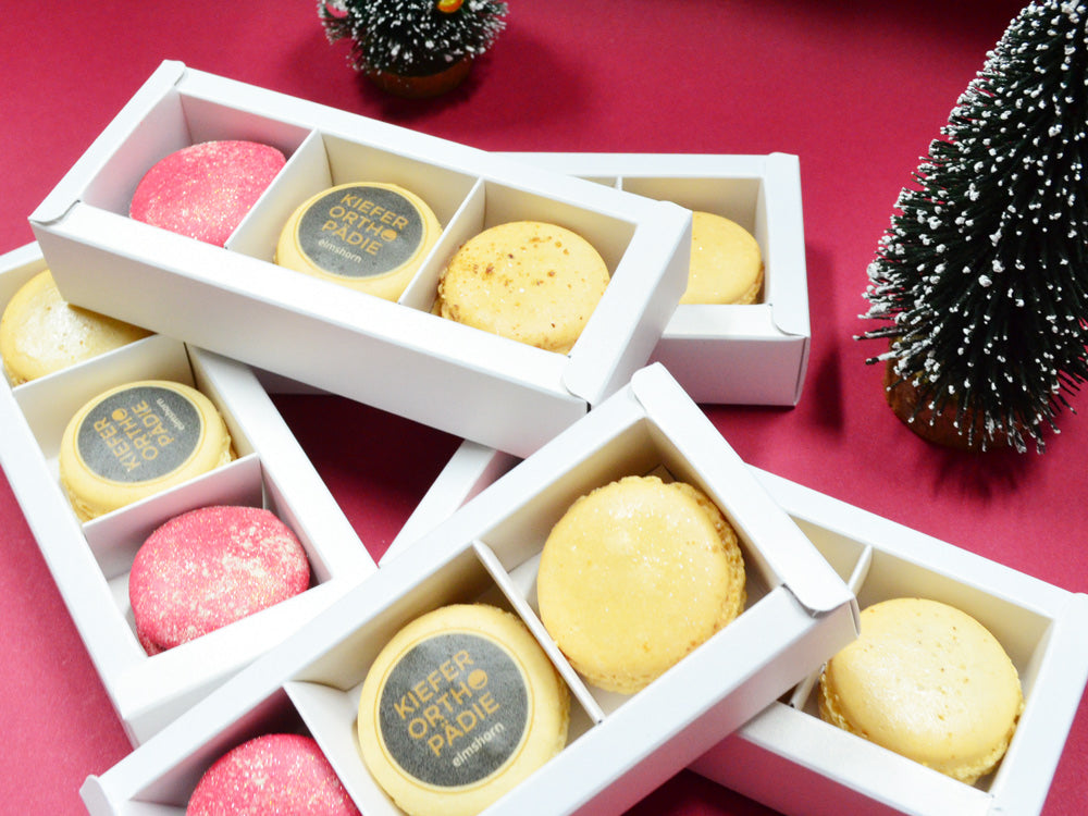 Sind Sie auf der Suche nach ganz besonderen Werbegeschenk für Ihr nächstes Seminar, die kommende Konferenz oder die nächste Ausstellung oder wollen Ihren Gesten bei der nächsten Party oder einem anderen Event ein unvergessliches Giveaway mitgeben? Für all diese Anlässe bieten wir Geschenkboxen in verschiedenen Größen und Zusammenstellungen an, beginnend mit einem Macaron in einer hübschen Verpackung. Auf Wunsch können Sie die Macarons auch personalisieren und etwa mit dem Logo Ihrer Firmea versehen lassen.