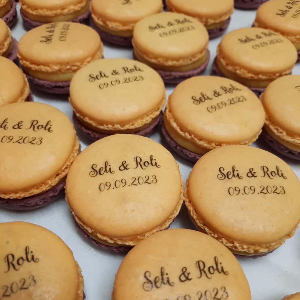 Unsere handgefertigten Macarons kannst Du mit den Namen Deiner Gäste oder kleinen Botschaften bedrucken lassen. Wähle in unserem Sortiment Farben und Geschmacksrichtungen, die zum Thema Deiner Feier passen und teile uns Deinen Wunschtext mit. Deine Gäste werden von diesen eleganten Leckerbissen begeistert sein.