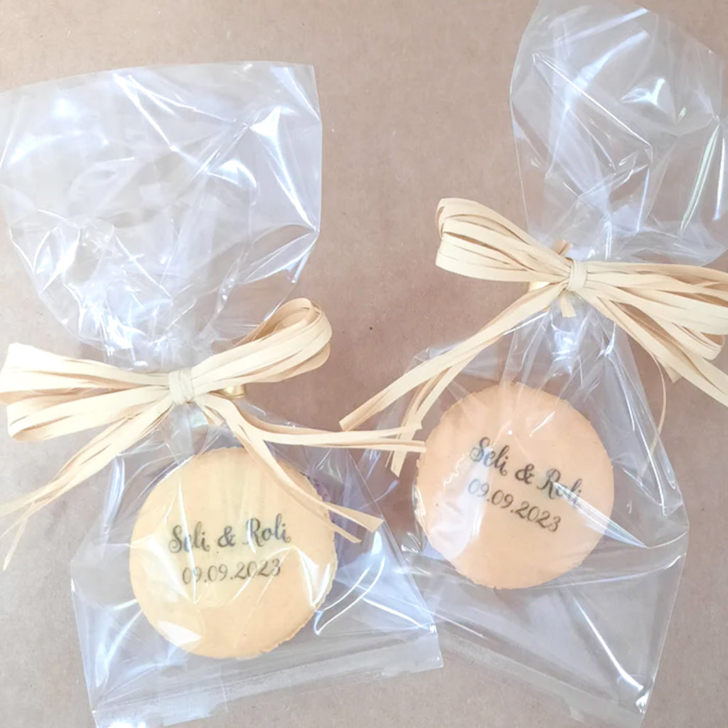 Unsere handgefertigten Macarons kannst Du mit den Namen Deiner Gäste oder kleinen Botschaften bedrucken lassen. Wähle in unserem Sortiment Farben und Geschmacksrichtungen, die zum Thema Deiner Feier passen und teile uns Deinen Wunschtext mit. Deine Gäste werden von diesen eleganten Leckerbissen begeistert sein.