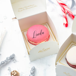 Auf Wunsch kann ein Macaron mit dem Namen der Person personalisiert werden, für die der Adventskalender bestimmt ist. Ein kleines, liebevolles Detail, das den Kalender noch besonderer macht und ihn zu einem einzigartigen Geschenk werden lässt.